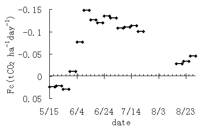 また、CO2とH2Oの収支は、それぞれ、5/15-7/23の70日間では、-5.5 tCO2 ha-1(-1.5 tC ha-1)、116 mm、8/16-8/30の15日間では、-0.55 tCO2 ha-1(-0.15 tC ha-1)、9 mmであった。また、観測されていない7/24から8/15の期間について、7/19-7/23と8/16-8/21の平均値を内挿し、5/15-8/30の108日間について同様に収支を算出した。その結果、CO2交換量は、-7.6 tCO2 ha-1(-2.1 tC ha-1)、H2O交換量は、153 mmとなった。